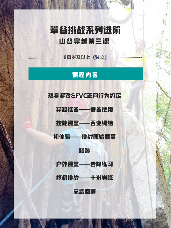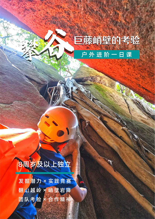 攀谷挑战系列,有别于寻常户外郊游爬山,针对6-12岁青少年户外综合体验的特殊玩法。