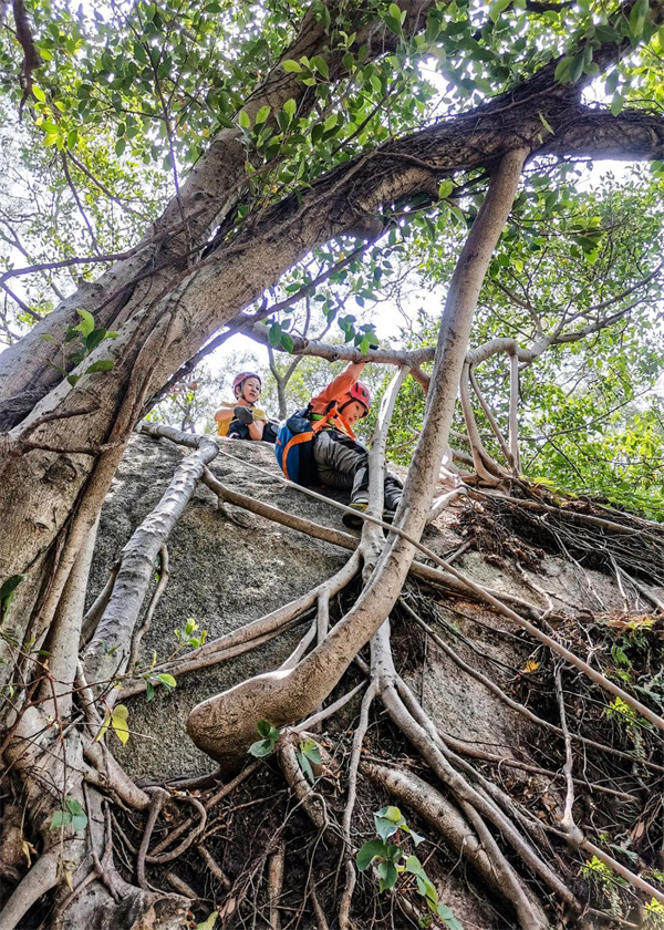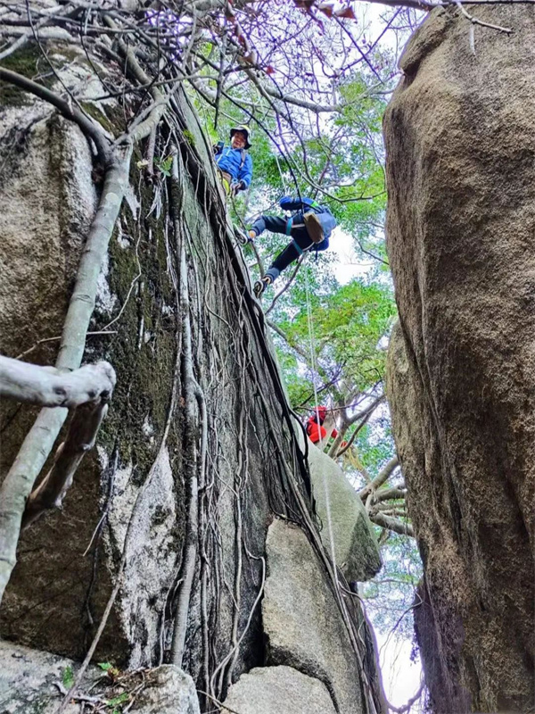 翻越过了巨石群,前面是布满藤蔓的崖壁。古树生长在石头缝里,盘根错节的树藤沿着巨石延伸,相互缠绕,野趣十足。
