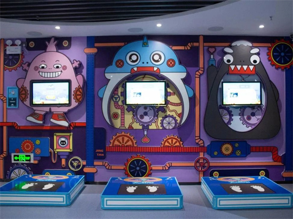 孩子和家长配合穿越5块指压板获取谜面,再次穿越指压板向答题者比划谜面内容,答题根据比划内容猜题。以此类推。每一组根据完成时间进行计时排名。