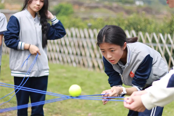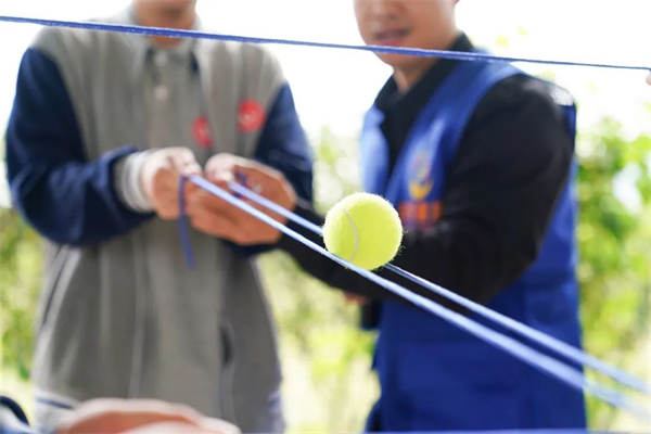 轨道传输:手拉细线,形成三个或四个的平行轨道空间,通过配合协作使网球在轨道中安全的行走到终点,最后安全进入桶中才算成功。