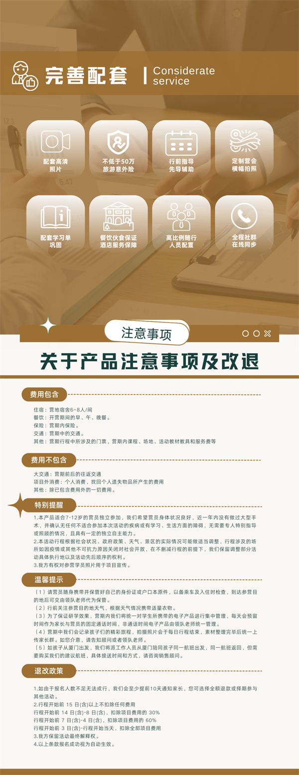 其他:营期行程中所涉及的门票,营期内课程、场地、活动教材教具和服务费等