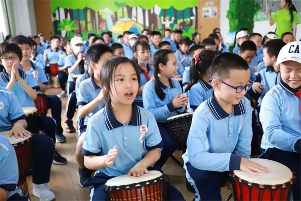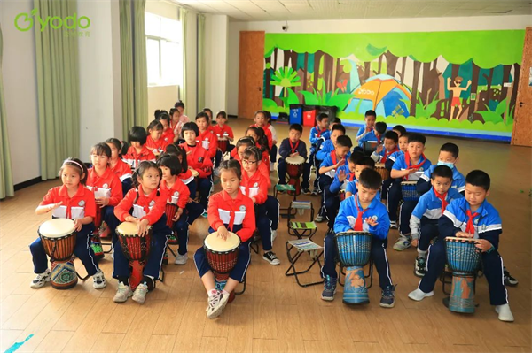 孩子们在导师的指导下,进行了一场动感十足的非洲鼓合奏。节奏感十足的鼓声,让现场气氛瞬间活跃了起来,孩子们在愉快的氛围中学习到了新技能,同时也感受了一波传统打击乐器的魅力。