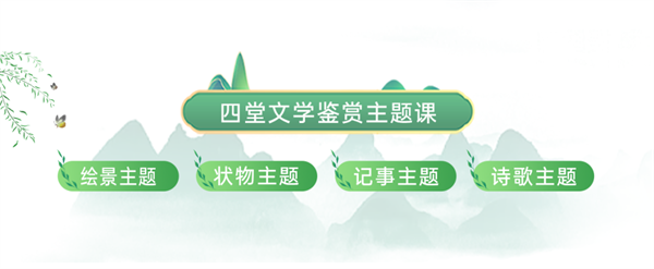 四堂文学鉴赏主题课,从绘景、状物、记事、诗歌四个主题出发,由文学鉴赏到阅读技巧到写作素材积累。让写作回归生活,成为孩子生命体验的激情表达。
