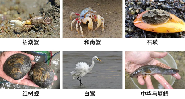 家庭成员还有很多浮游生物、螺类、贝类、鸟类等生物,会螺旋打洞的和尚蟹,边吃边拉的石磺,拥有强大的保护色的不等蛤,躲在暗处放冷枪的鼓虾,大长腿的白鹭!