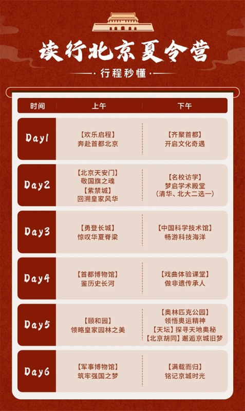 深入参观高校校园,与在读大学生交流、全方面了解高校的历史文化、学习生活、校园制度、重点学科及专业设置。(清华或北大选择其中一所,如政策性限制,则参加人民大学)