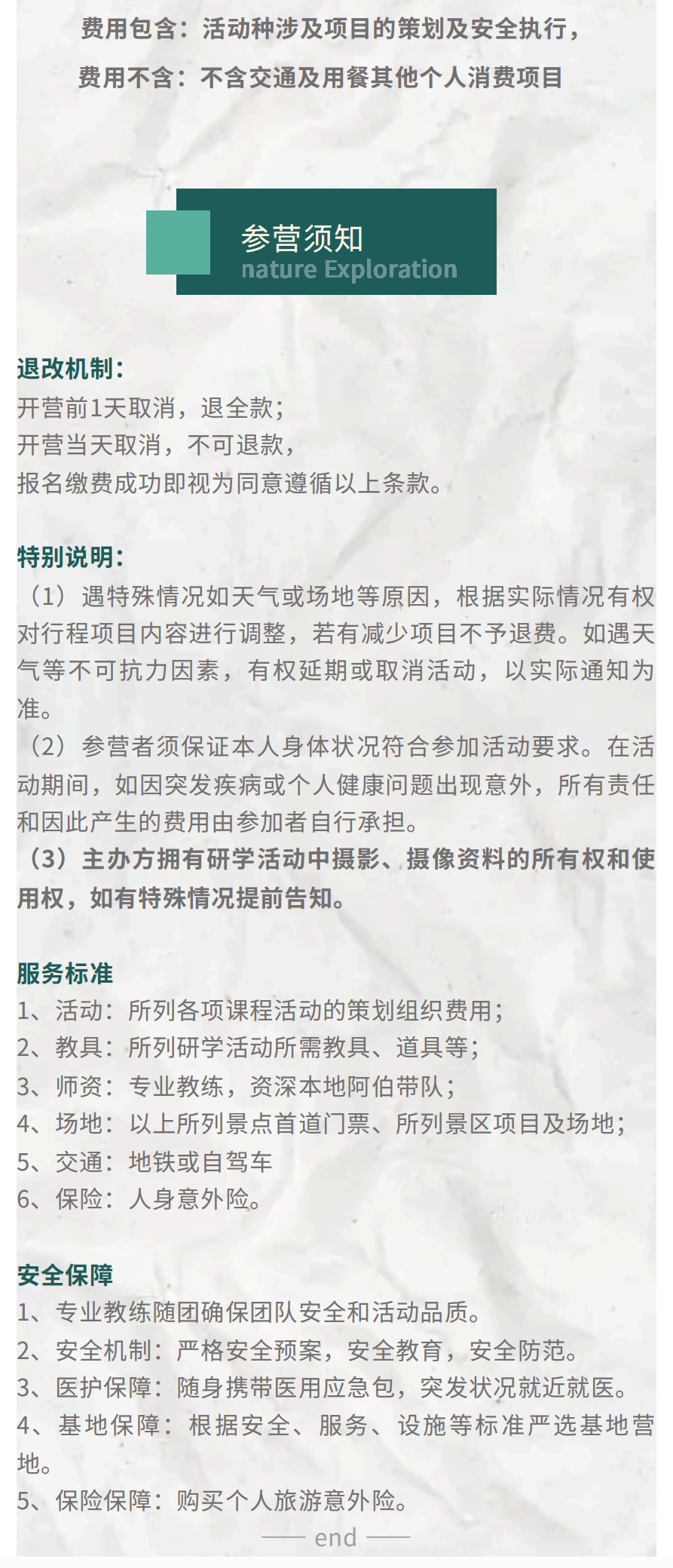 1.遇特殊情况如天气或场地等原因,根据实际情况有权对行程项目内容进行调整,若有减少项目不予退费。如遇天气等不可抗力因素,有权延期或取消活动,以实际通知为准。