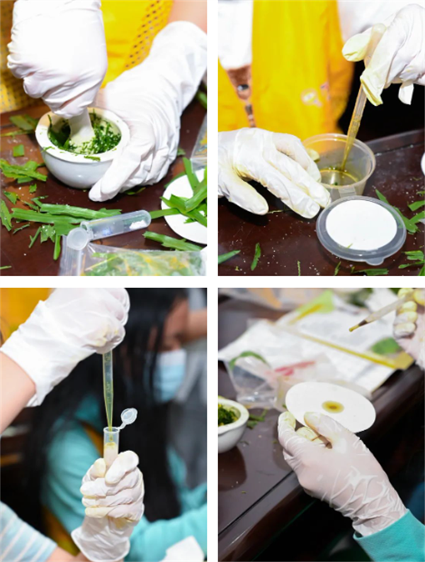 实验结束,各个小朋友的叶绿素提取成果如何,失败或者成功,都是不同的体验。根据实验结果,老师分析现象及原因,了解层析法分离叶绿素的原理及结果。