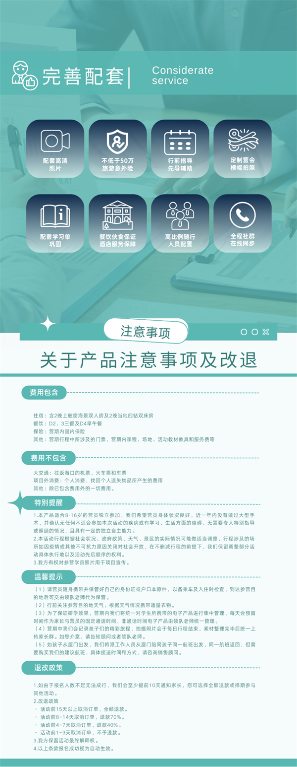 1、如由于报名人数不足无法成行,营地会至少提前10天通知家长,您可选择全额退款或择期参与其他活动。