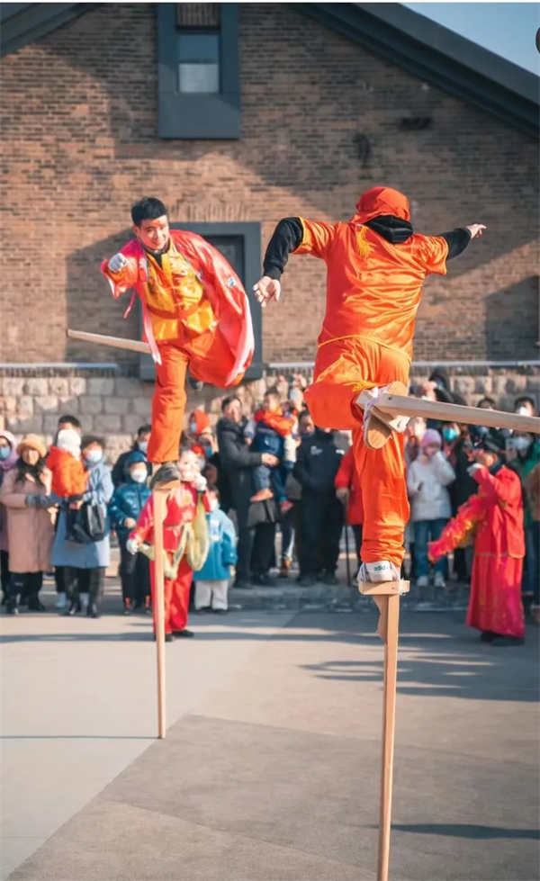 体验【踩高跷】手持道具,双脚踩着木跷,边跳边押。