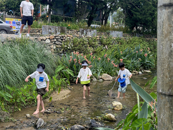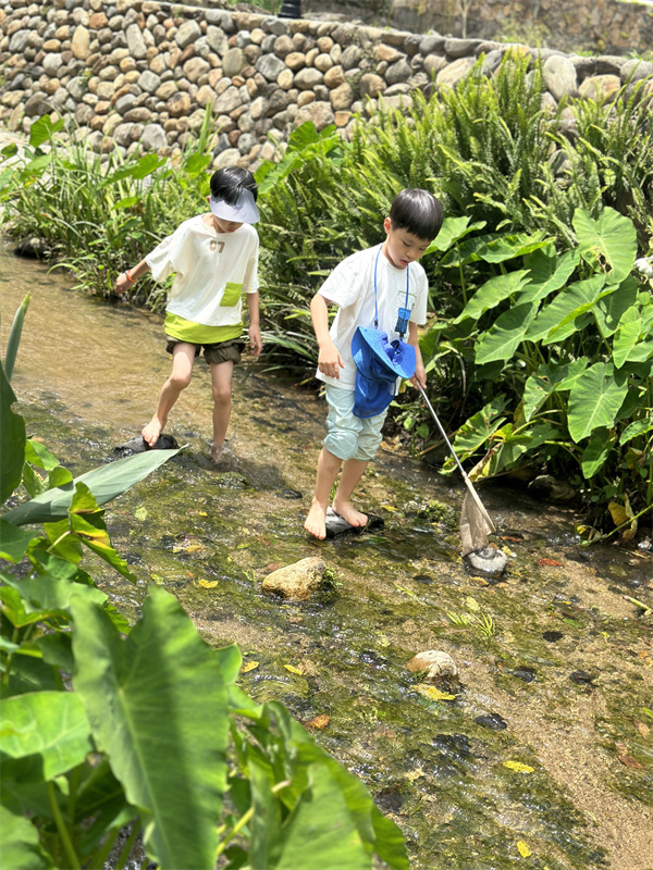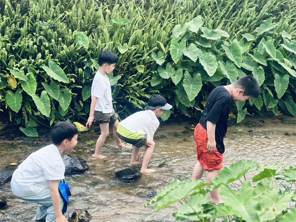 在乡村小溪里摸虾捉鱼