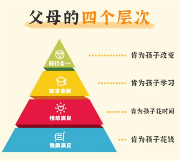 肯为孩子改变的父母,处在金字塔最顶端,而只满足孩子物质,单纯肯为孩子花钱的父母,则排在最后。
