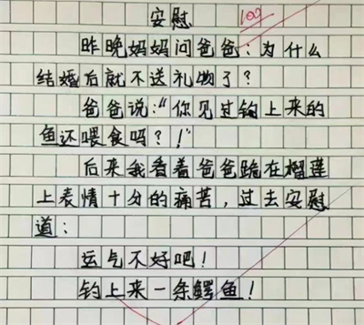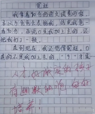 我拿着90分的语文试卷回家,本以为爸爸会表扬我,结果我爸一看90分,非说0是我加上去的,还把我打了一顿。