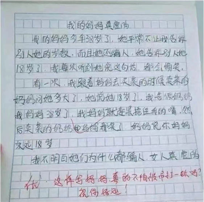 我的妈妈今年38岁,她平时不让我告诉别人她的岁数,而且她还骗人,她告诉别人她18岁了,我每次听到她说这句话,都会偷笑。