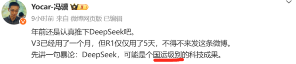 游戏科学创始人、CEO,《黑神话:悟空》制作人冯骥评价DeepSeek:可能是个【国运级别】的科技成果。
