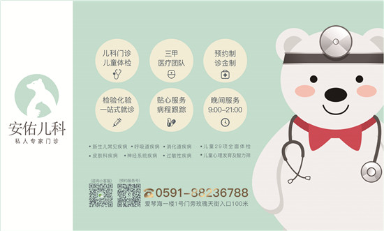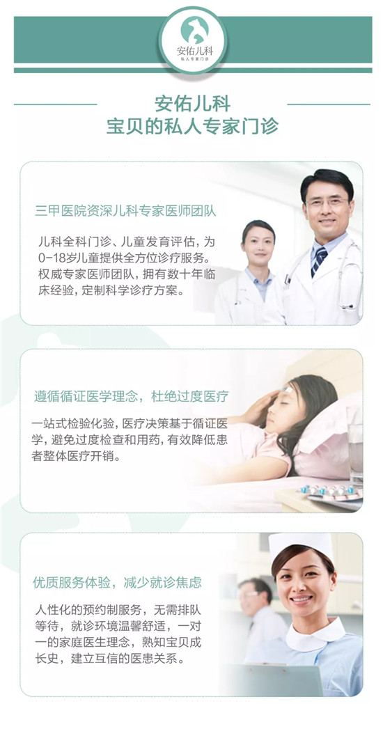 安佑儿科是一所为儿童提供专业化、人性化、高质量的医疗保健服务机构。倡导中西医结合的诊疗方式,致力于改善儿童就医环境、预防疾病、合理营养、提高机体免疫力等方面,与您的孩子健康相伴。