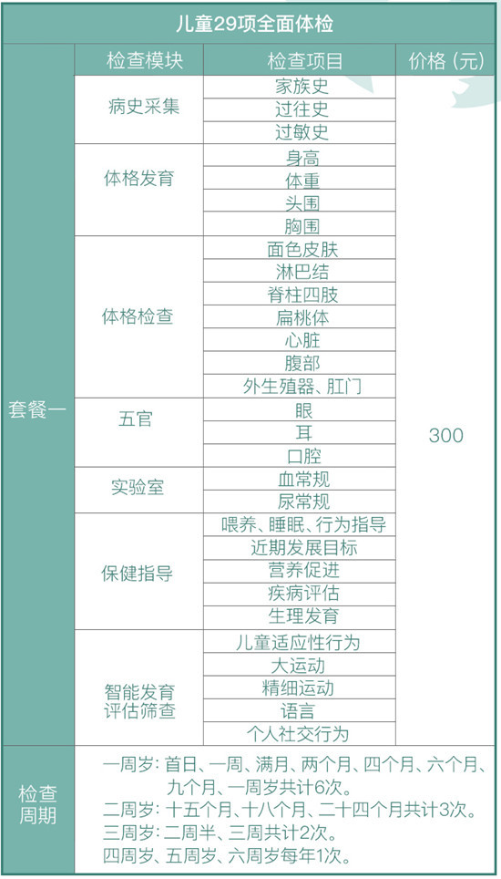 所含项目:1.喂养、睡眠、行为指导;2.近期发展目标;3.营养促进;4.疾病评估;5.生理发育6.预防接种疫苗指导