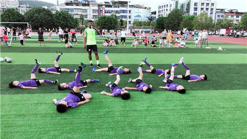 教学形式:将足球巧妙融合进游戏中,慢跑、压腿、绳梯训练、正面小跑、侧面小跑步、两侧移动跑等基础训练。抢截球、假动作加强技术、战术联系和团体意识,强化技术动作和战术配合,加深对场上位置的职责意识。
