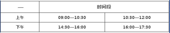 上午档1 9:00-10:30,上午档2 10:30-12:00,下午档1 14:00-15:30,下午档2 16:00-17:30