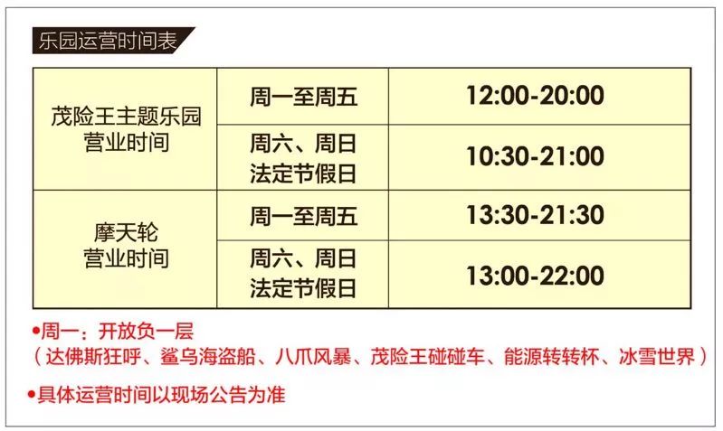 (周一:开放负一层(达佛斯狂呼、鲨乌海盗船、八爪风暴、茂险王碰碰车、能源转转杯、冰雪世界)