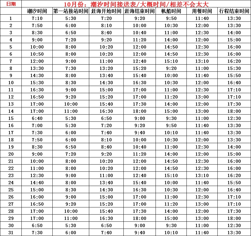 行程当天将视潮汐情况调整行程时间!!!顺序!!!