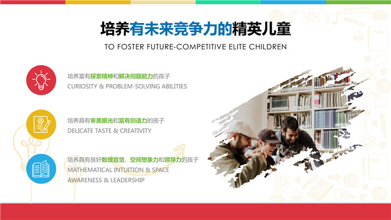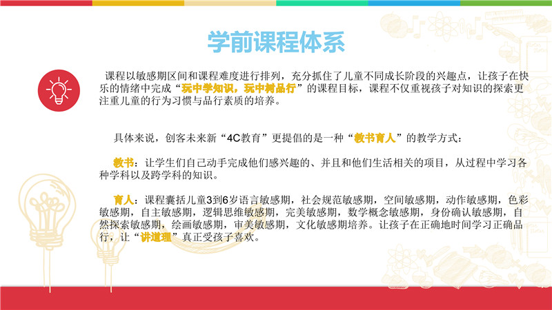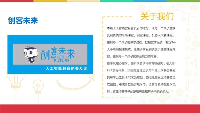 创客未来开设乐高、编程、机器人大赛等课程,基于认知心理学、脑科学及学科教育等研究,引入IB-PYP课程体系,以国际文凭组织与牛津大学联合开发的思考力工具IB-TOK为基础,瞄准儿童思维培养黄金启蒙期,多媒体互动游戏学习、全新体验搭配教学玩具,真正培养孩子的逻辑思维和解决问题的能力。