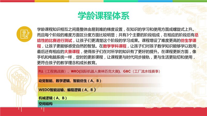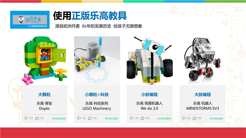 乐高的课程是培养机器人的创造者,孩子们会在其中广泛学习机械和编程知识等应用数学和物理的内容,这样也使STEM课程能够很好的在乐高课程中得到体现。