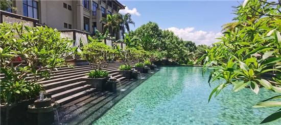双层挑高叠水游泳池,将泳池和溪流浑然一体。成排棕榈环绕下,连泳池也沾染上了绿意,一瞬间,恍如置身巴厘岛~