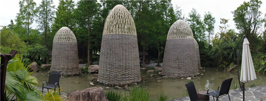 溪山温泉独创私密汤屋——疍家人,造型独特的蛋形编笼在绿林间时隐时现,白天与夜间有不同的魅力。