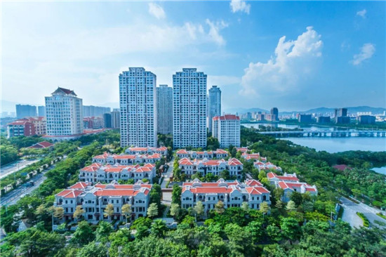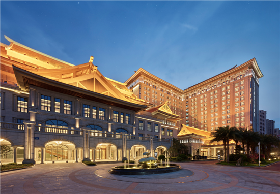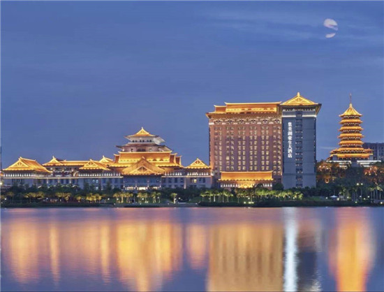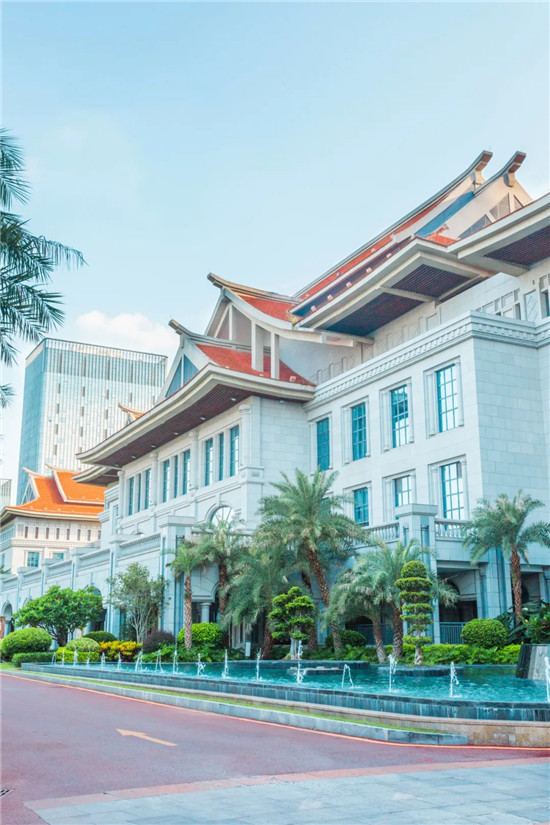 厦门集美湖豪生大酒店外观为红瓦飞檐闽南式屋顶与西洋式屋身结合而成的典型嘉庚式建筑风格, 将南洋时尚感与中式元素融合,塑造独特的建筑美学。