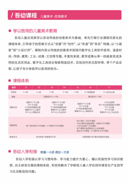 吾幼儿童应用美学以吾幼传统的创意美术为基础,率先打破行业课程同质化的课程体系,引导孩子的思维从“创意”向“创作”,从“务虚”到务实的转换,课程内容多样,让孩子充分体验学以致用的快乐。