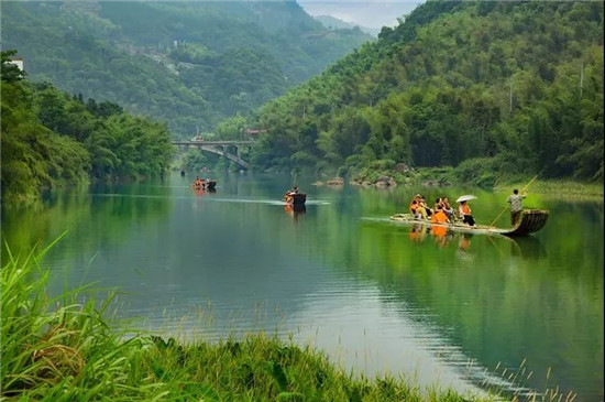 【九鲤溪】以山清水秀、风光秀美而著称,诗称“门拥千峰翠,溪无一点尘”。蜿蜒25公里的九鲤溪,如翠绿色的腰带,低徊缠绕,沿岸青山重回,绿树葱茏。以此天然美景为依托。