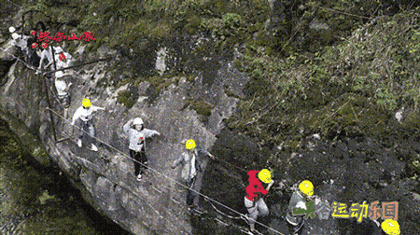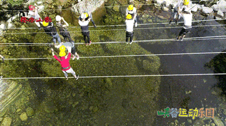 【携手并进】两人在举步维艰中互相帮助,携手并进,默契配合,共荣共生,才有奇迹出现,可不要看脚下碧绿的河水,你的眼里只应有你的伙伴。