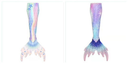 脚蹼和鱼尾:美人鱼的脚蹼专用的美人鱼单蹼,和自由潜的双蹼和单蹼都有所不同哟。美人鱼单蹼设计更像鱼的尾巴,为了配合鱼皮,主要设计偏美观,动力不像自由潜单蹼那么强,在岸上看起来笨重的尾巴在入水的一刻立即被唤醒,变得逼真轻盈!