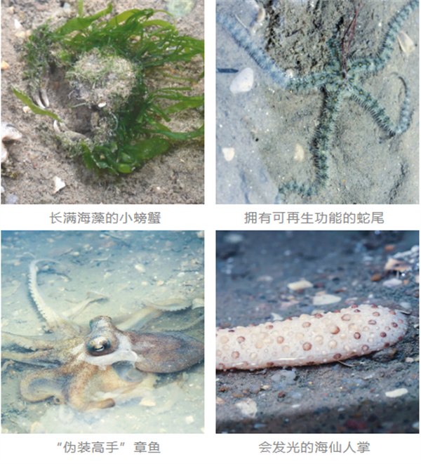 看!这只长满海藻的小螃蟹,就算是眼尖的人类,如果不仔细看,也很难发现吧!这个蛇尾,有超强的可再生能力!还有章鱼,它们可是伪装高手,幸运的话,还能看到章鱼快速“逃亡”的样子。大海里的海仙人掌也是会发光的哟~