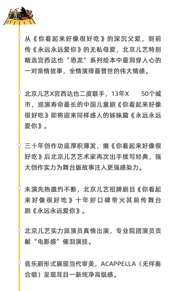音乐儿童剧《永远永远爱你》作为《你看起来好像很好吃》中霸王龙爸爸故事的前传,《永远永远爱你》讲述了他——也就是童年时期被称为“良太”的霸王龙爸爸,和他的慈母龙妈妈之间的一段甜蜜又心酸的往事。