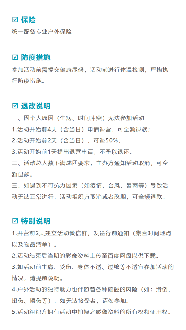 4、定制包团产品需要提前预约档期,并在确定档期后支付50%活动定金,在活动确定开营一天前支付实际报名人数费用扣除已付定金后的剩余星款。如因因甲方原因取消定制活动,可无偿进行延期一次,取消活动定金费用不做退还,作为活动取消损失,或者延期使用。