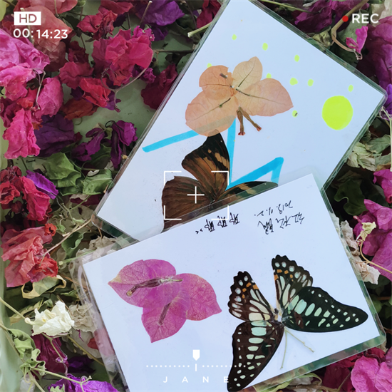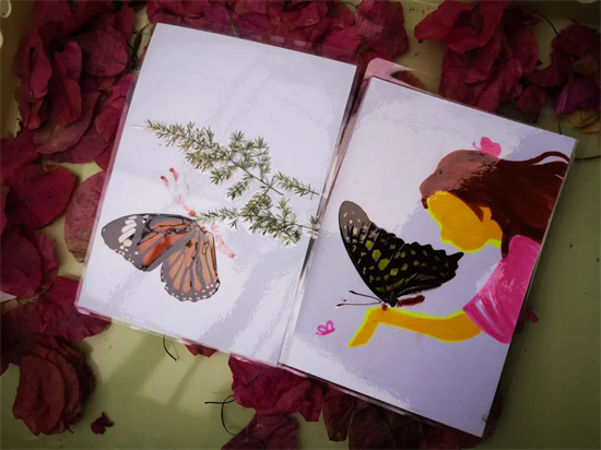 通过老师的引导,观察蝶翅与叶子的形状,取之自然,活用自然,在轻松愉快的体验中发挥各自的想象力和创造力,设计制作有趣的碟翅书签。