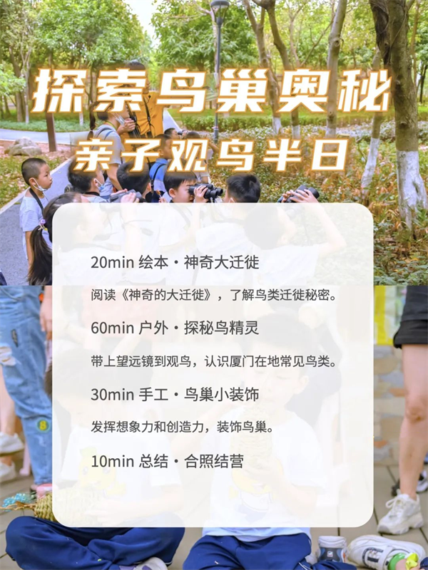 本次活动,我们创新性结合自然教育、艺术创作、创意手工课程活动,通过针对性的课程学习,让孩子们走进奇妙的鸟类世界,在观鸟的特色“学习”中开启自然探索之旅,培育爱鸟爱自然爱自然的自觉意识和行动。