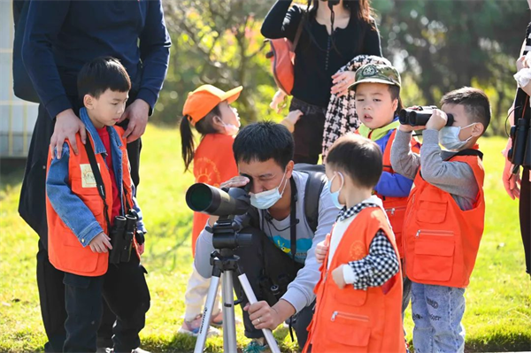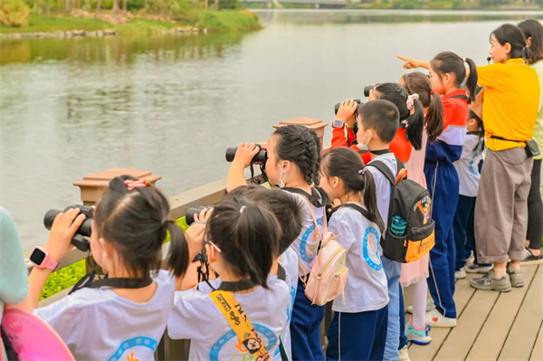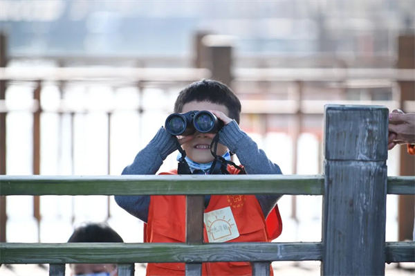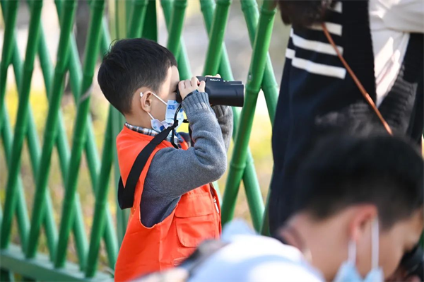 自然导师带领孩子们来到观鸟长廊和观鸟屋,一起探秘鸟精灵,认识普通鸬鹚、苍鹭、大白鹭等迁徙的冬候鸟,了解园博苑常见的鸟类。