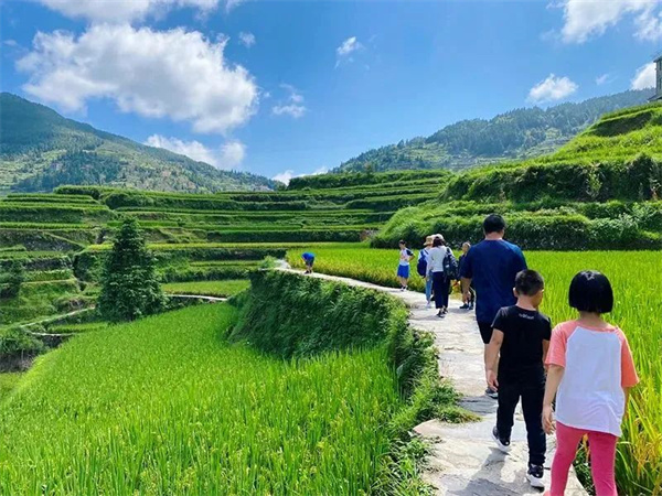 上午:堂安侗寨,自然生态博物馆、采摘乌树叶,制作乌米饭;之后前往体验梯田徒步,体验山里孩子的上学路
