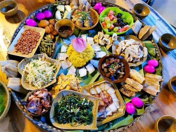 用簸箕做盘,垫上新鲜嫩绿的芭蕉叶,再装满荤、素、主食、水果杂粮等各种美食,美食拼盘,应有尽有,完美!
