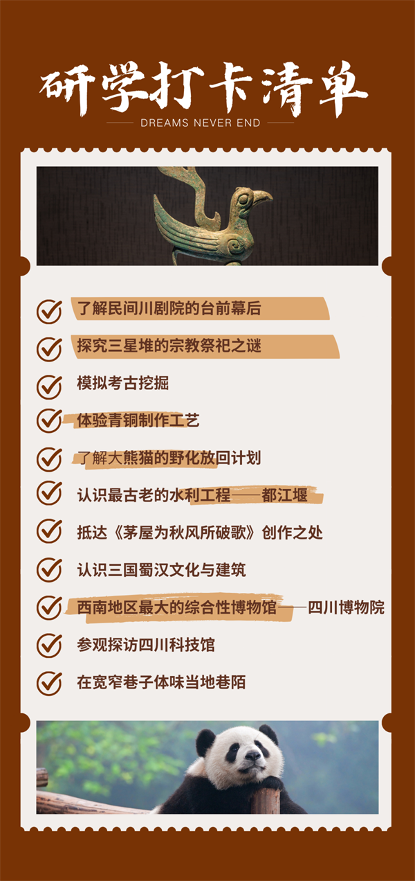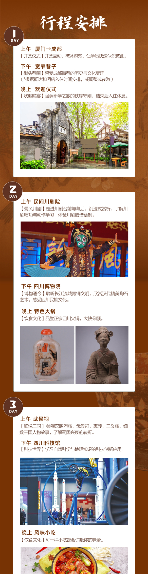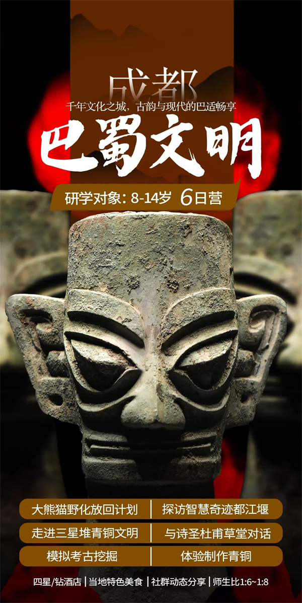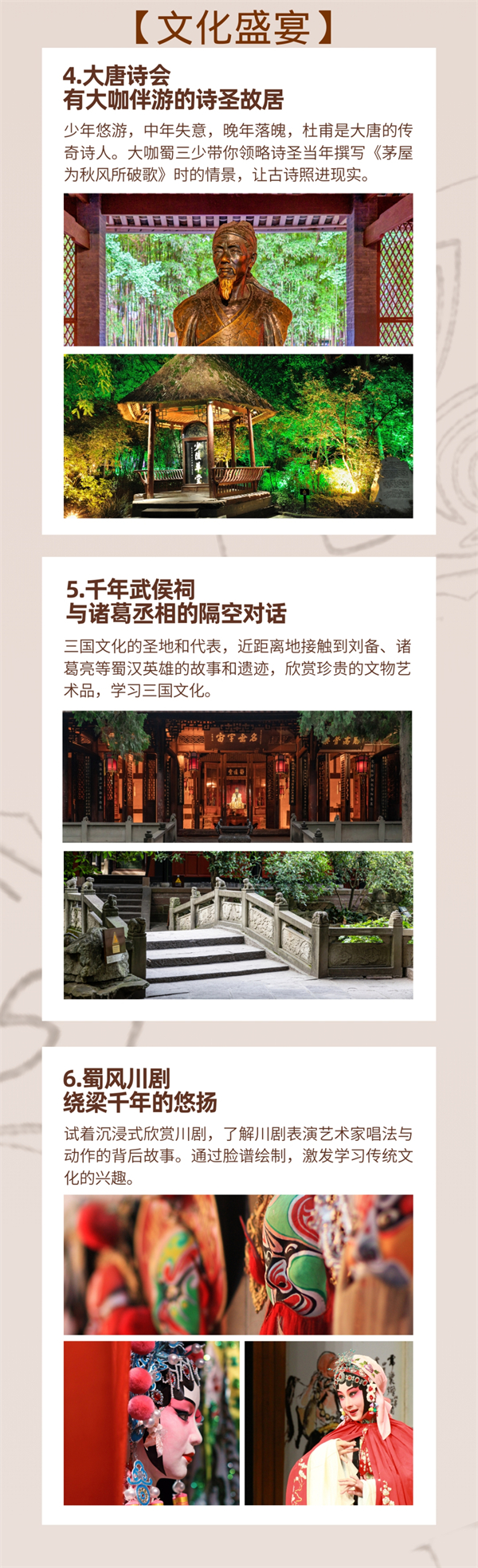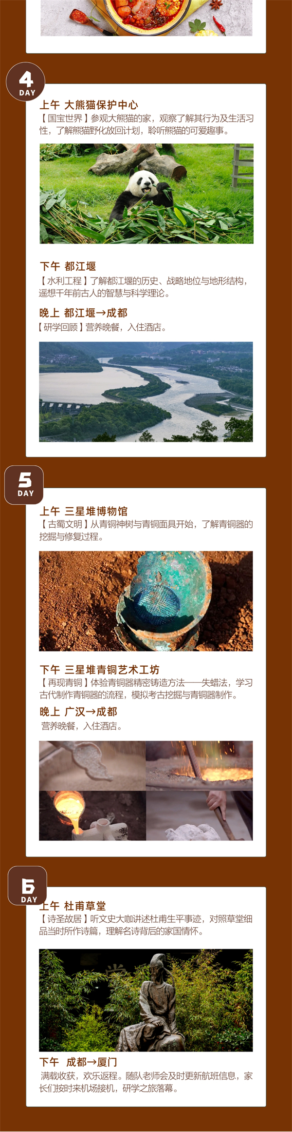 餐饮: 开营日午餐、晚餐,结营日早餐、午餐,及其他研学行程中的三餐,穿插安排成都火锅等当地特色美食。