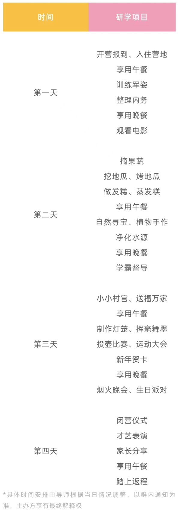 营会档期:1月27日-1月30日、2月1日-2月4日、2月14日-2月17日3月18日-3月21日
