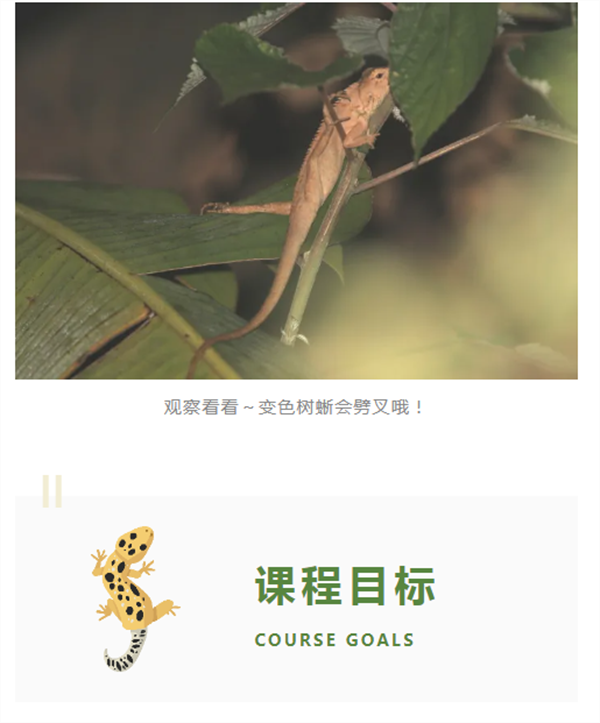 沉浸自然,学习两爬动物的特征与习性,了解物种与环境的关系;
