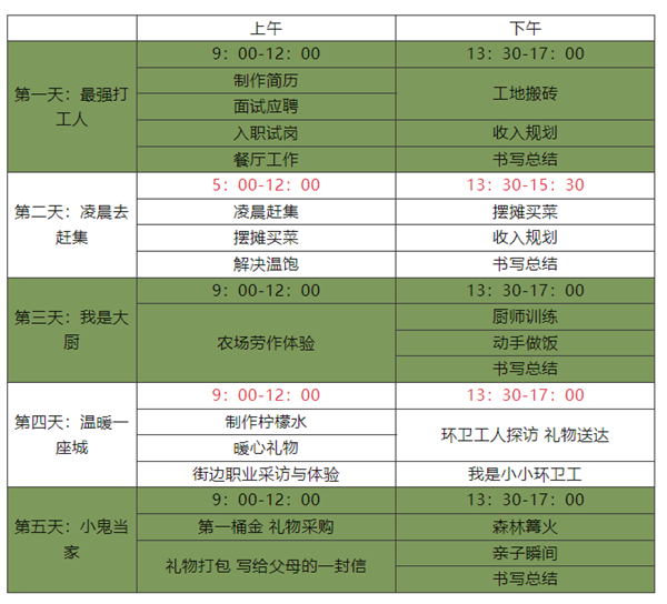 04 学会珍惜:吃苦不是目的,重要的是孩子们能从差异化的生活方式中感知当下的幸福,去理解家人创造的优越生活环境来之不易,更加懂得珍惜和感恩,进而常怀一颗爱心,为环卫工人送去温暖,温暖一座城,培养孩子们爱心。