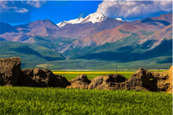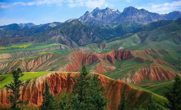 【祁连卓尔山“东方小瑞士”】:祁连卓尔山山下种有油菜花和青稞,远处有彩色丹霞,绵延雪山。