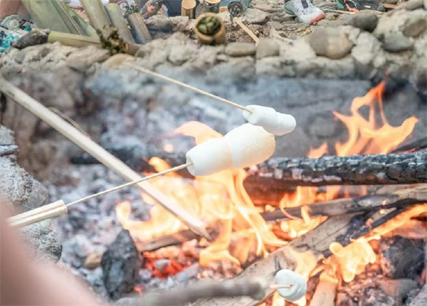 成功搭建好火坑后,何不来犒劳犒劳一下辛勤劳动的自己!冬日里一串外焦里嫩的烤棉花糖,香甜可口,简直是乐趣满满啊!