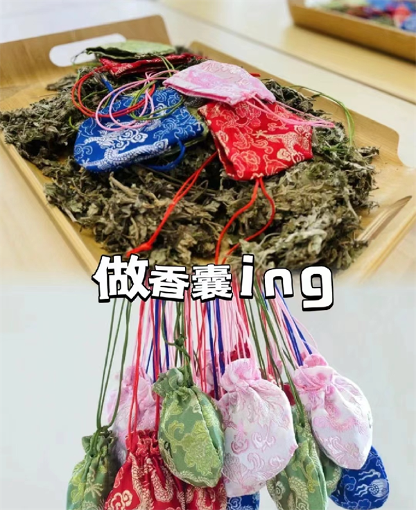 04 通过收集材料制作香囊,锻炼他们的动手能力和手眼协调能力。同时小朋友可以了解和体验传统文化,培养对文化传承的意识;