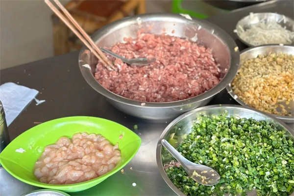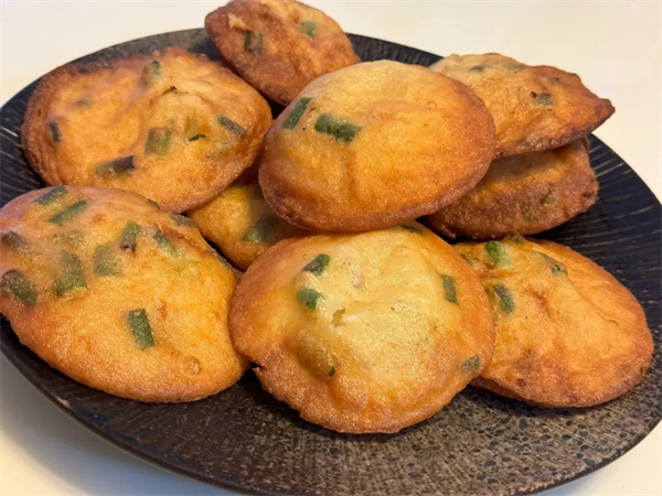 用面糊包裹馅料,将制作好的灯盏糕放入热油中油炸。炸至灯盏糕表面金黄酥脆即可捞出沥油。乎乎的灯盏糕外酥里嫩,馅料鲜美可口,咬一口就能感受到满满的幸福感。