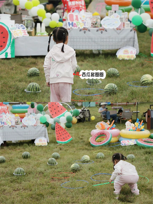 两队PK,每人3次机会在指定地点站好进行套圈,套中真西瓜即获得胜利,套中真西瓜最多的可额外获得一个大西瓜。
